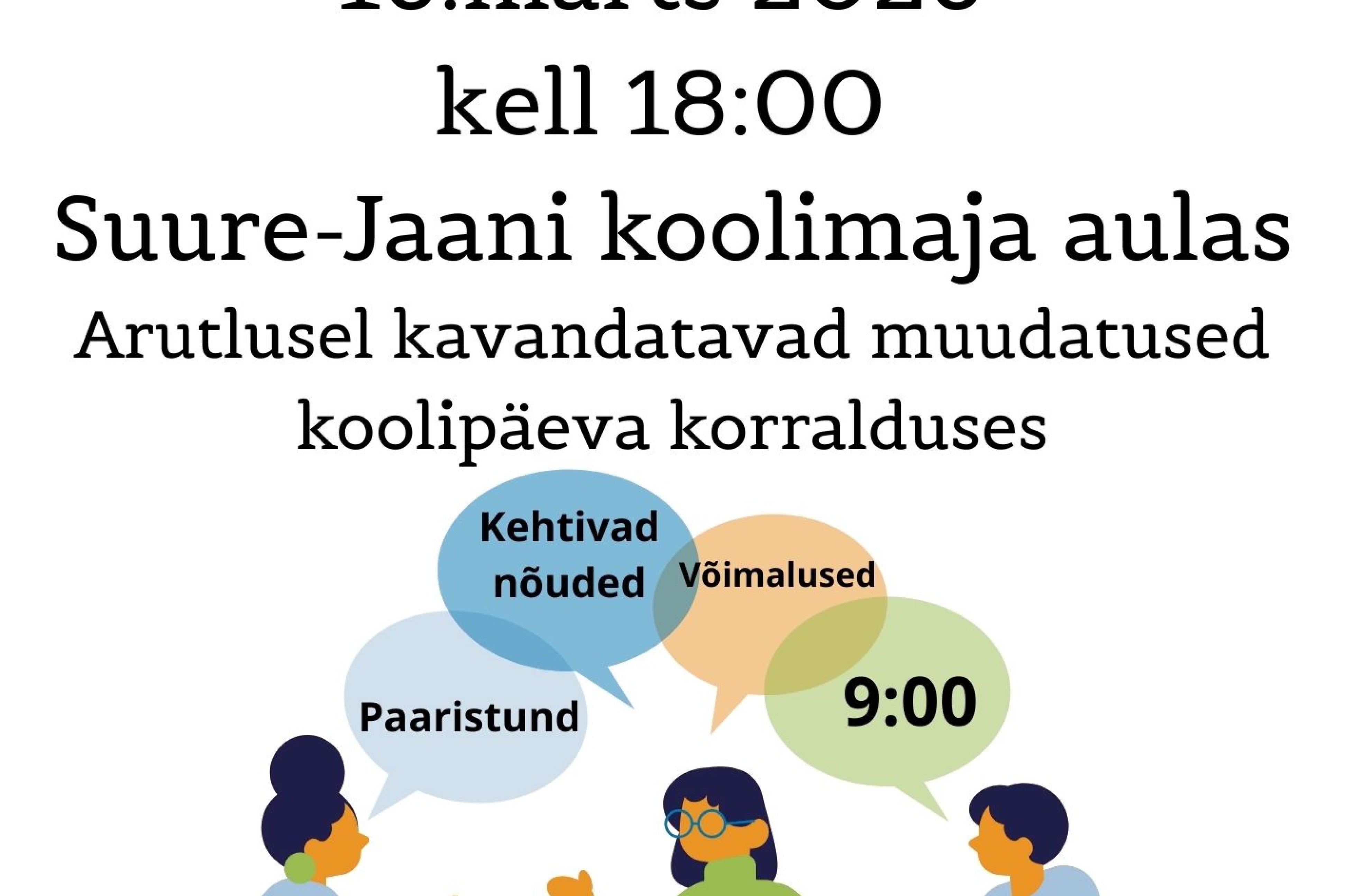 Aeg 00:00 - 23:59 Asukoht Suure-Jaani Aula Suure-Jaanis Õppetöö Sürgavere tegutsemiskoht Suure-Jaani tegutsemiskoht Tääksi tegutsemiskoht Ava foto Lastevanemate üldkoosolek Vaata rohkem sündmusi Ava foto Avaldatud 02.03.2026. Viimati muudetud 02.03.2026.