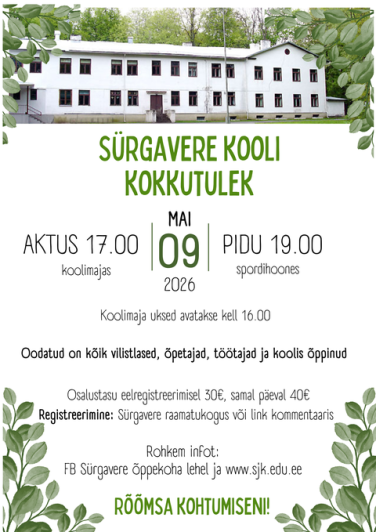 09.Mai.2026 09 mai 2026 23.märts.2026 23 märts 2026 Sürgavere Kooli kokkutulek Sürgavere tegutsemiskoht Aeg 17:00 - 23:59 Rohkem infot Sürgavere tegutsemiskoht Ava foto