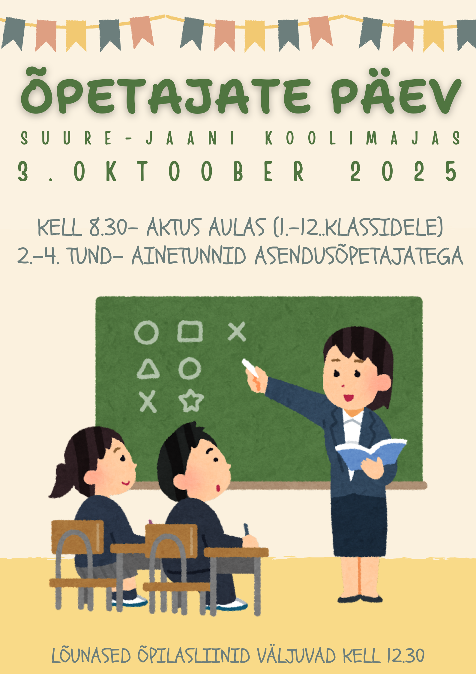 Mihklipäeva laat Loomise kuupäev 25.09.2025 Autor Huvijuht Matkapäev Loomise kuupäev 25.09.2025 Autor Huvijuht Keeltepäev Loomise kuupäev 25.09.2025 Autor Huvijuht Lastevanemate üldkoosolek Loomise kuupäev 11.09.2025 Autor Huvijuht Vaata rohkem