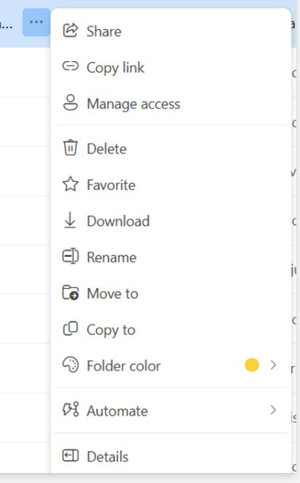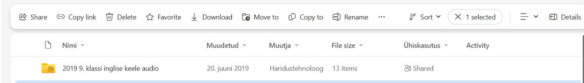 share - jagamine; copy link - kopeeri link; delete - kustuta; download - saab arvutisse allalaadida; move to - saab liigutada kuskile mujale kausta; copy to - saab kopeerida; rename - muuda nime; sort - sorteerimine