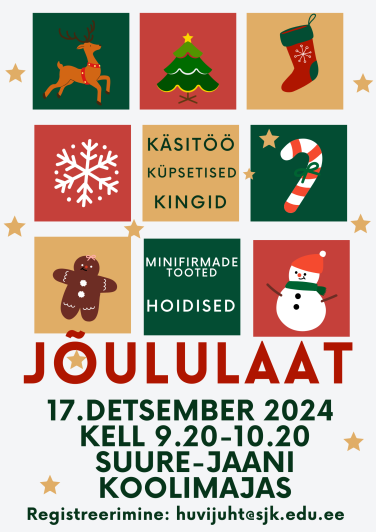 Kell 9.20-10.20 on kõik huvilised oodatud Suure-Jaani koolimaja esimesel korrusel toimuvale jõululaadale, kus müüvad õpilased ja lapsevanemad enda tehtud meisterdusi, käsitööd, maiuseid ja ka minifirmad on oma toodetega väljas. Laadal toimub arveldamine ainult sularahas.