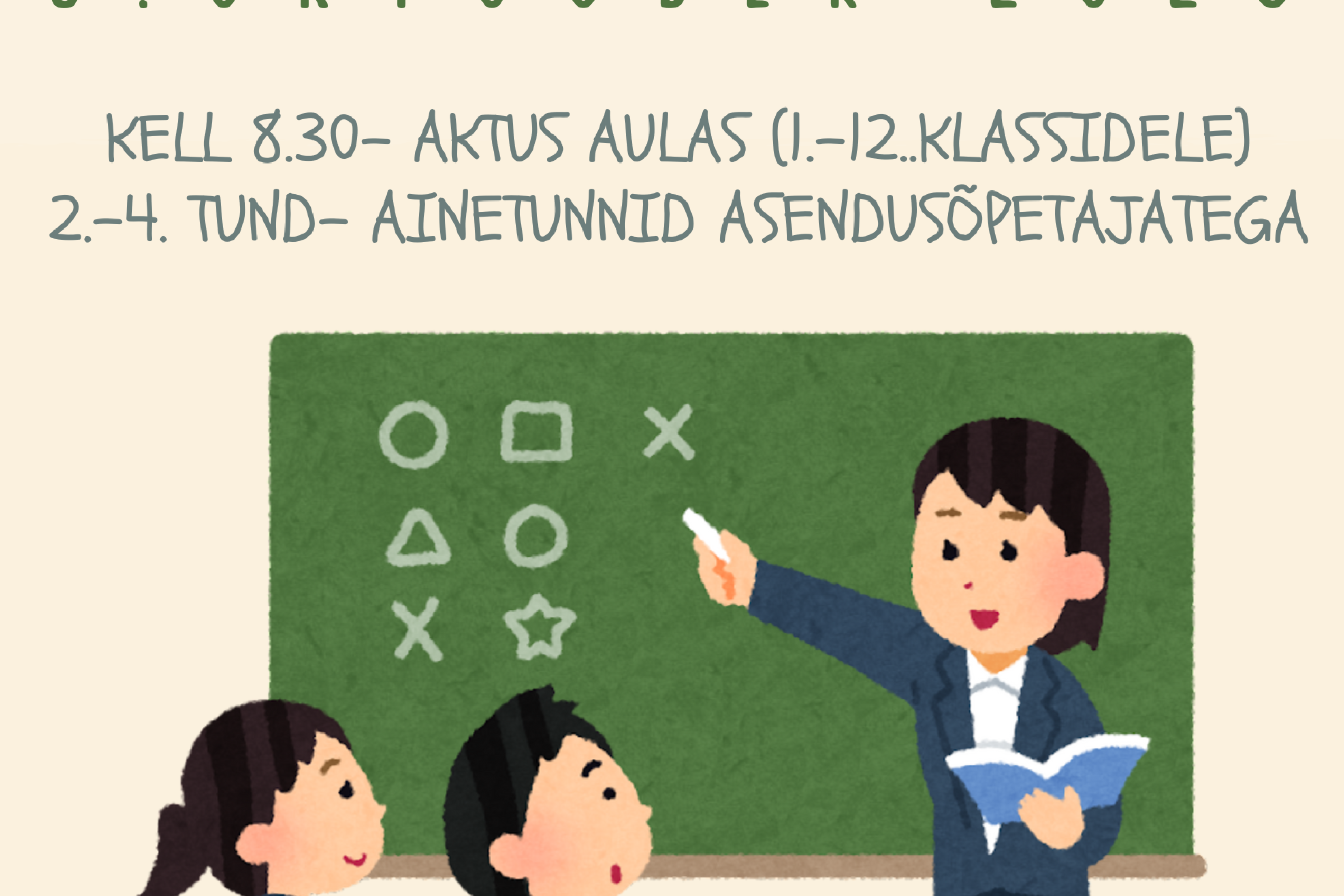 Mihklipäeva laat Loomise kuupäev 25.09.2025 Autor Huvijuht Matkapäev Loomise kuupäev 25.09.2025 Autor Huvijuht Keeltepäev Loomise kuupäev 25.09.2025 Autor Huvijuht Lastevanemate üldkoosolek Loomise kuupäev 11.09.2025 Autor Huvijuht Vaata rohkem
