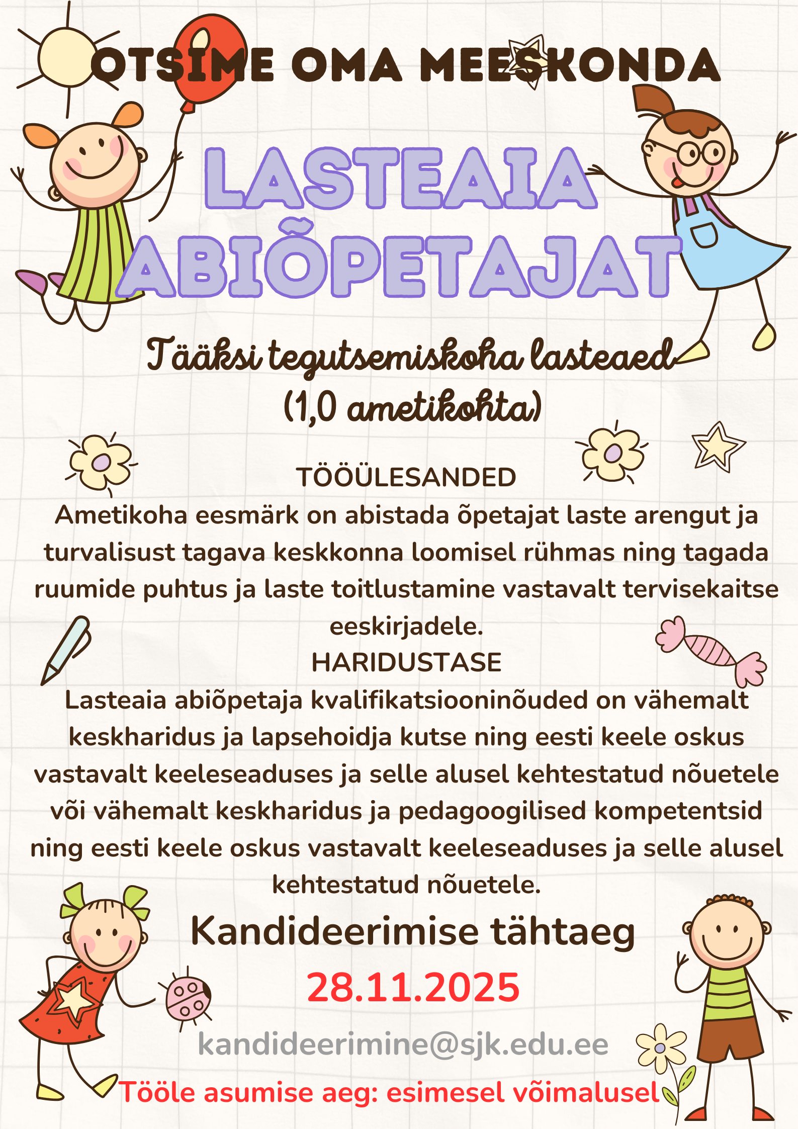 Ametikoha eesmärk on abistada õpetajat laste arengut ja turvalisust tagava keskkonna loomisel rühmas ning tagada ruumide puhtus ja laste toitlustamine vastavalt tervisekaitse eeskirjadele.